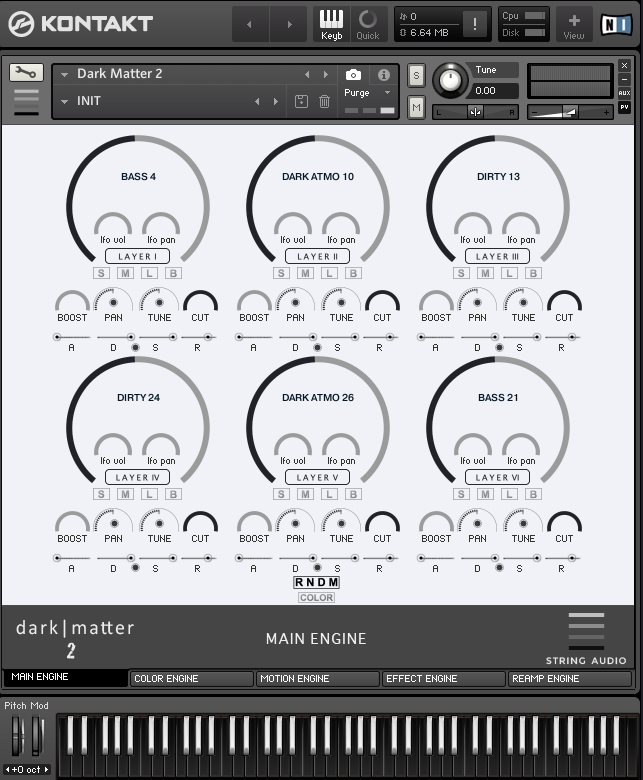 Main Engine: Individual layer controls for pitch, volume, pan, solo, mute, effects bypass, layer lock, adsr, layer boost and cut, pan and amp LFO send.